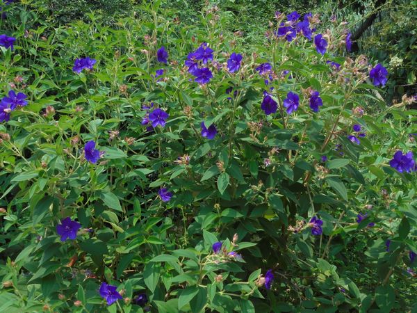 庭のノボタンの花弁が地上にあちこち散らばっている。シコンノボタン(紫紺野牡丹)という品種である。ブラジルや東南アジアが原産地だと言われている。我が家では7月から10月にかけて綺麗な花を樹間いっぱいにわたり次々と咲く。このノボタンは「1日花「」である。咲いた花弁はすぐに落ちてしまうけれど、また次から次へと花が着いては咲き花期は長い。毎年花が終ったら夏期剪定を行う。放っておけば樹高は3mを超えるので、高さを1~1.5mくらいにした方が管理がしやすい。半常緑樹になるが冬の寒さにやや弱いようである。