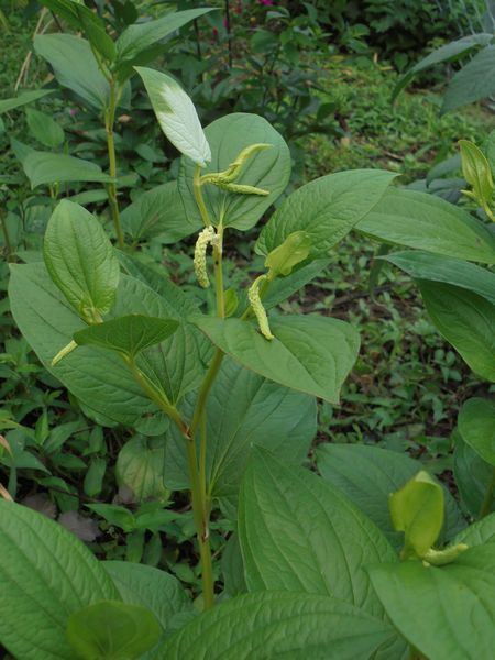 半夏生の花は、半化粧とか片白花などとも呼ばれている。ドクダミ(毒痛み)科に属する仲間になる花で、1年の真ん中あたりの6月中旬~7月上旬に葉の一部が白っぽくなり、尾っぽのような小さな髭状の花が咲く。葉の一部分が白く変化するのは、虫を集める(虫媒花としての)目的があるのではないか?との説がある。例年、ハンゲショウの花が咲く頃になると当地ではそろそろ梅雨も後半に入る。今日は梅雨前線の影響で大雨が降るとの予想が出ているが、土砂災害などが起きなければよいがと願う。