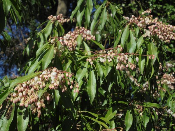 裏山で「馬酔木」の花が咲き始めた。細い枝に釣鐘状の花がびっしりと着いている。アセビの樹は字を読んで分かるように、葉を馬が食べると中毒になることからこの名が付いた。本来、アセビは高山に自生する樹だが、我家のものは園芸店で求め移植したもの。黄色系、薄ピンク系の2種類を植えている。横にはニホンミツバチの巣箱を置いているが、暖かい日には菜の花、カワズザクラ、ミモザアカシアの蜜を吸いにミツバチが盛んに出入りしている。