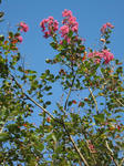 庭の百日紅(サルスベリ)に花がびっしりと着いて青空に映えている。屋敷横に数十年前に植え付けたものだが樹高も4mを悠に超え毎年決まってこの時期に花が咲く。サルスベリには赤系やピンク系や白系のものなどいろいろな品種がある。長い期間咲くからとか、木肌が固くツルツルして猿も滑って登るのに苦労することからこの(サルスベリの)名前がついたのだという。