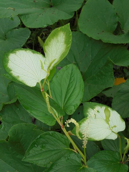 ドクダミ科に属する花で、花の長さは10~15cmほど。草丈は40~50cmくらいにまで伸びる。花は穂状の形をしており、花の向かい側の葉っぱは片面(表面)だけ白くなる。名前は外見からカタシログサ(片白草)とか半化粧(ハンゲショウ)などと呼ばれることもある。