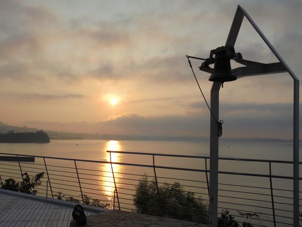 翌朝5時前に目が覚め朝ぶろの後にホテルの庭を散歩した。冷気が気持ち良くホテル内のチャペルの鐘越しに別府湾からの朝陽が見えた。穏やかな波間に反射して見事だった。まさしく「早起きは三文の徳」の気持ちになった。