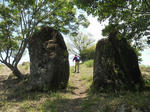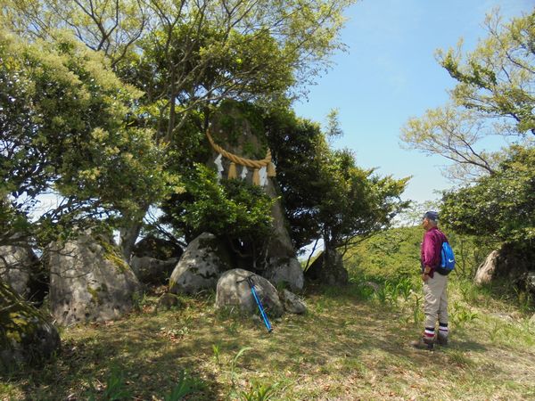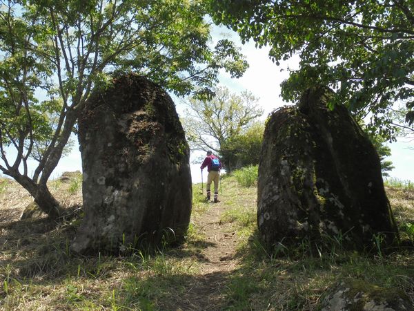 好天に恵まれストーンサークル付近でゆっくりと昼食を摂る。コンビニで買ったおにぎりも自然の中で食べるとまた格別である。巨石の周囲にヒオウギの瑞々しい葉が茂っていた。ヒオウギ(檜扇)は赤に斑の綺麗な花が咲く。京都の祇園祭の際に使われるという。ここのヒオウギは自生したのではなく誰かが植えたものだろう。